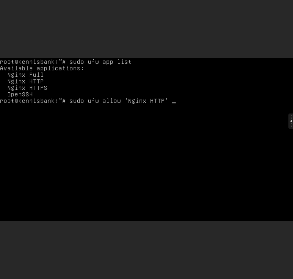 - We gaan nu de firewall openzetten. Het is aangeraden om dit alleen te doen voor de poort die je gebruikt, Voor ons gaat dit poort 80 zijn. Wij typen dus: sudo ufw allow 'Nginx HTTP'