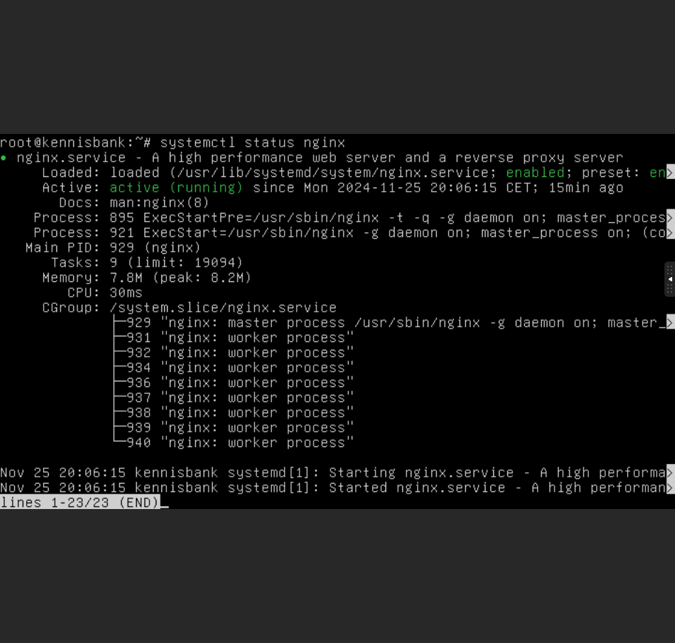 - Nu is Nginx geïnstalleerd, je kunt dit controleren door **systemctl status nginx **te typen. Hier zou active uit moeten staan.