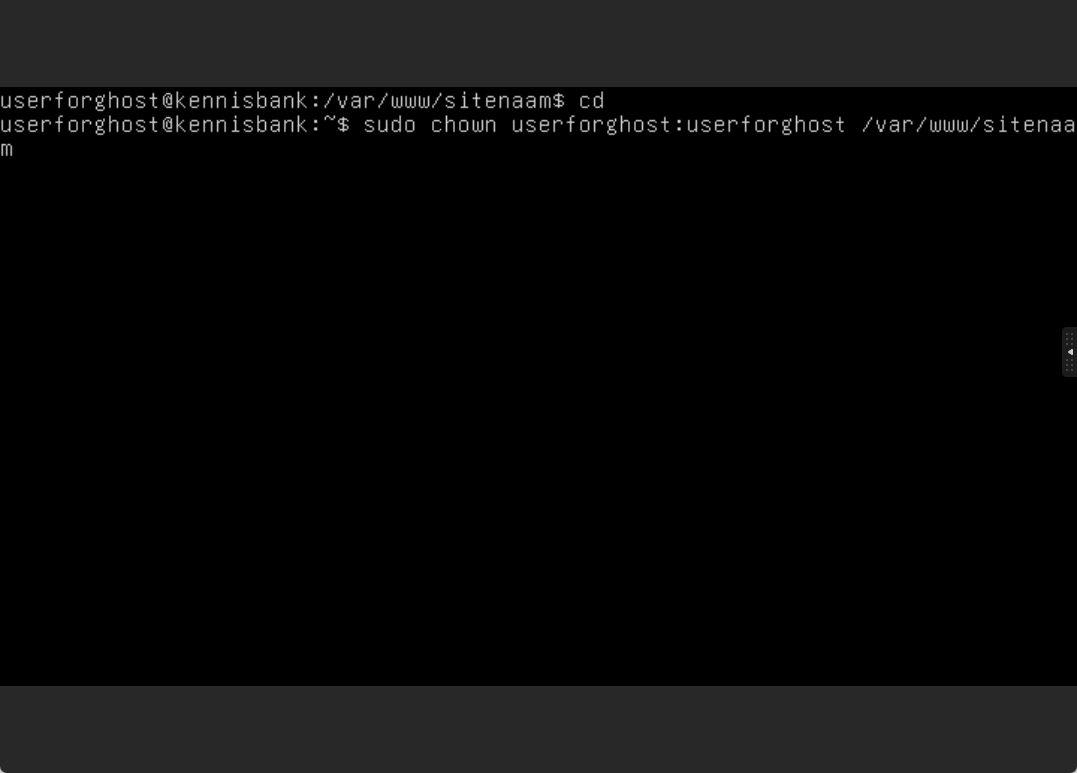 - We gaan een nu een user de eigenaar van de map maken, doe dit door sudo chown : /var/www/sitenaam. Vervang door de naam voor de @ in je terminal. Voor ons dus root.