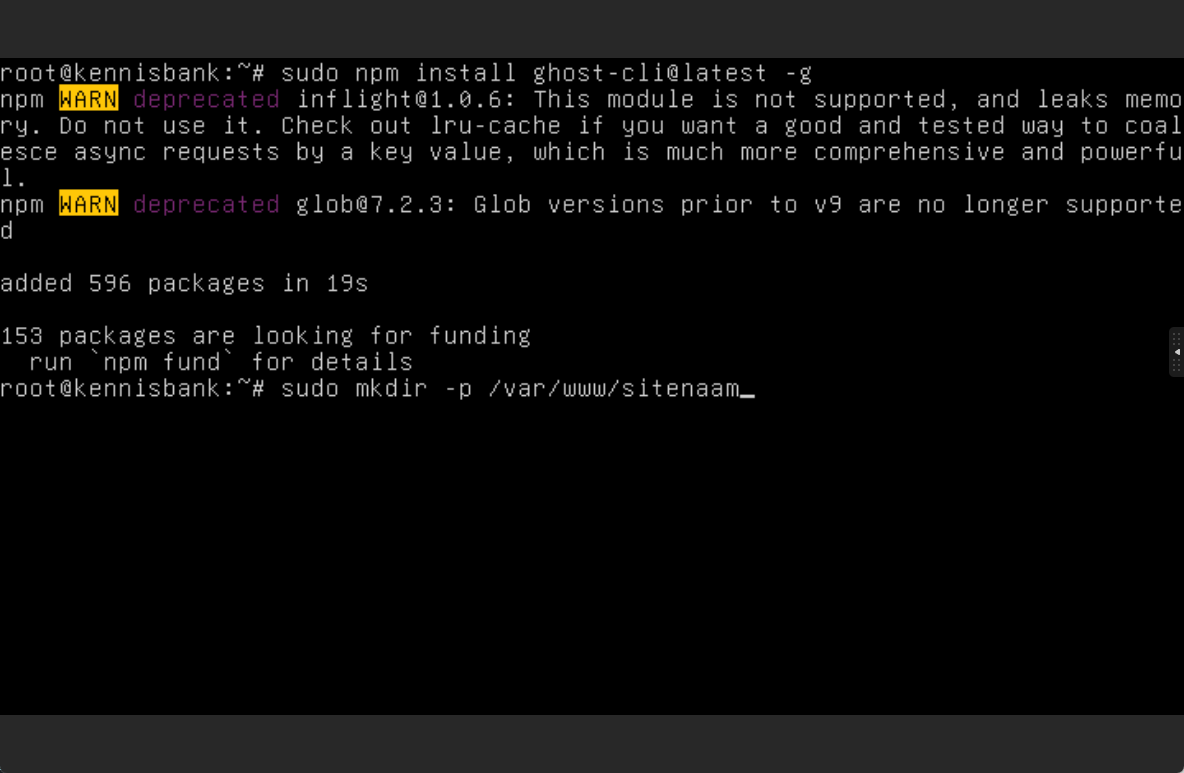 - We gaan nu de map aanmaken voor Ghost. De sitenaam kan je zelf aanpassen. We beginnen met: sudo mkdir -p /var/www/sitenaam