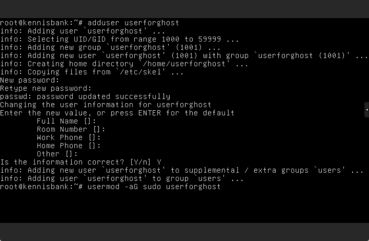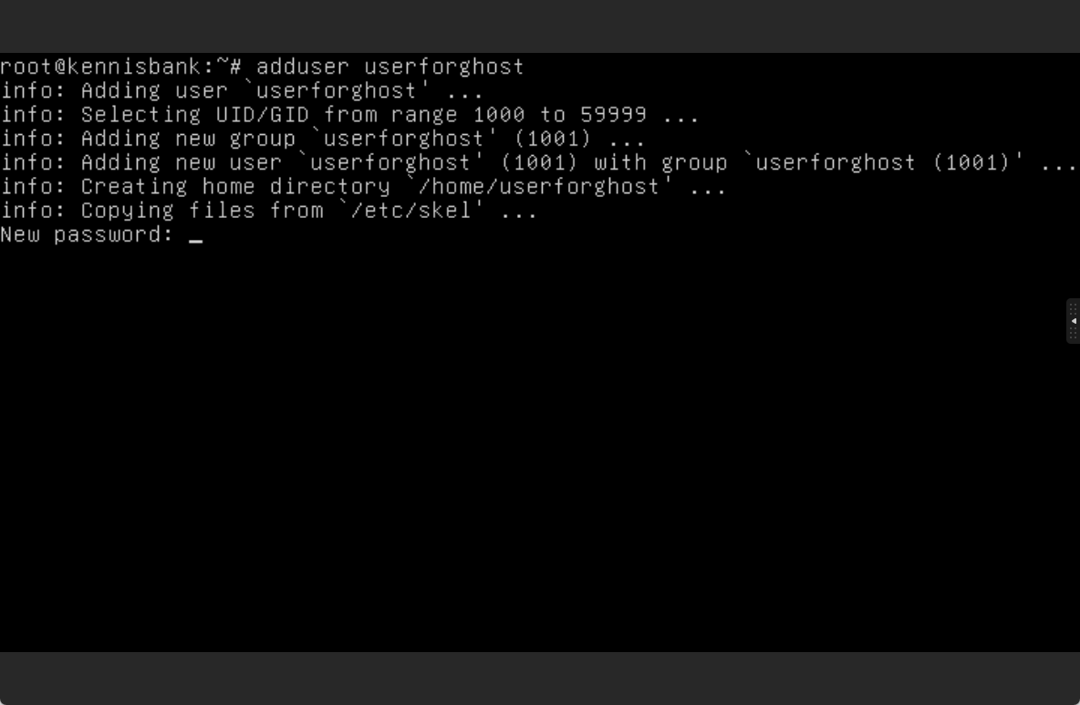 - We gaan nu een gebruiker aanmaken: Doe dit door eerst adduser . Bedenk zelf een naam voor user. Vul hier gelijk ook het wachtwoord in