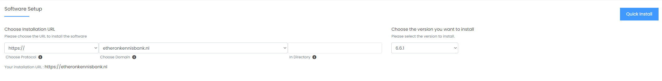 - Bij Software Setup, voer je je domein in. Als je Wordpress meteen wilt gebruiken laat **In Directory **leeg.