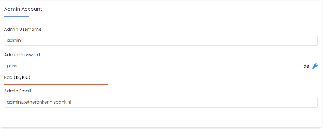 - Bij Admin Account vul je de gewenste gegevens in. Dit zijn de gegevens voor je WordPress Admin-pagina.