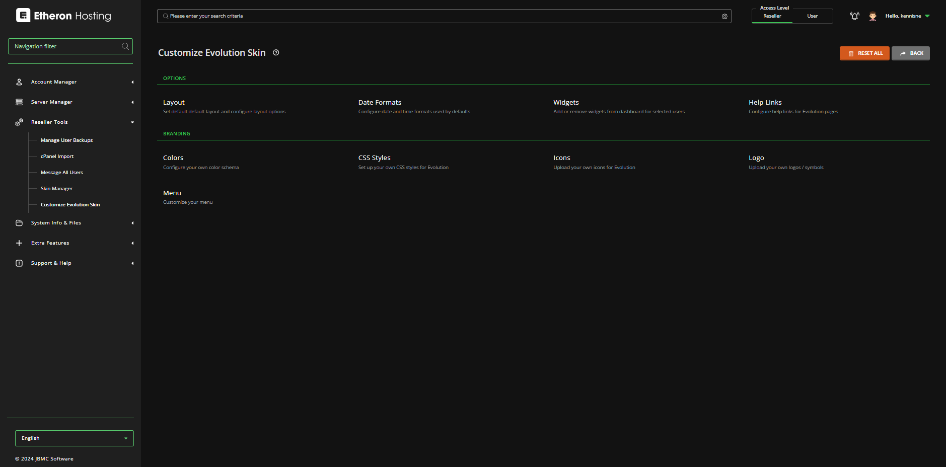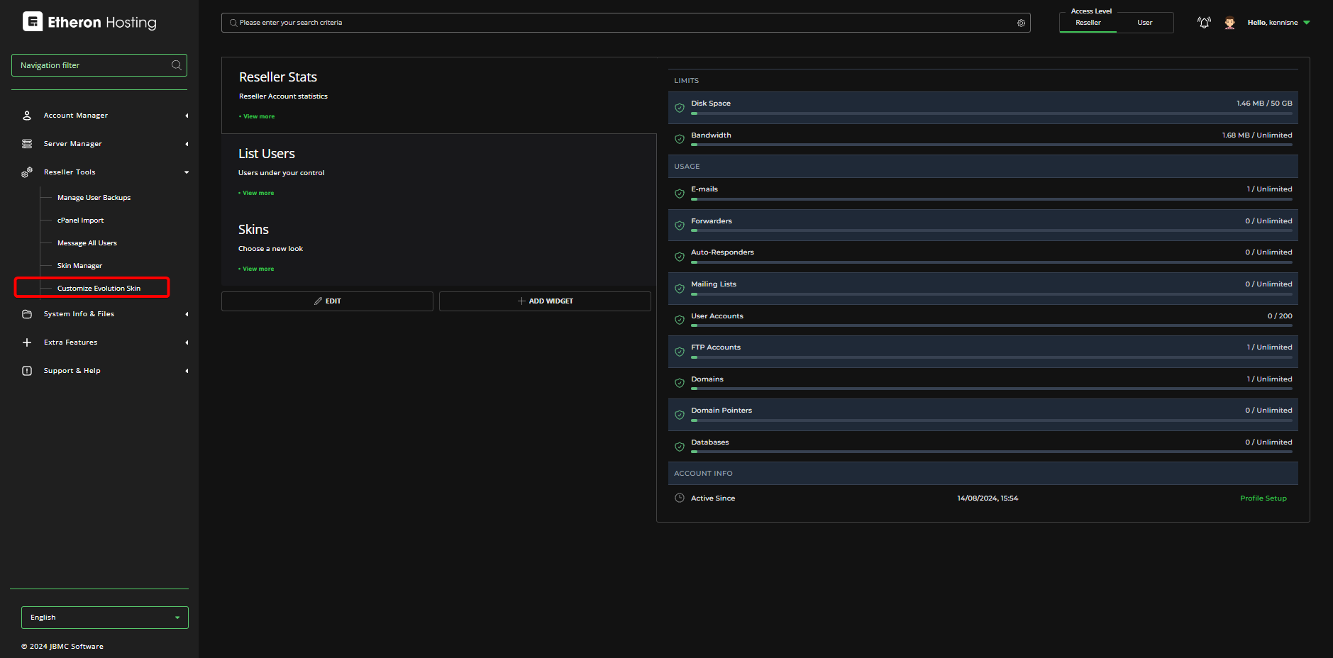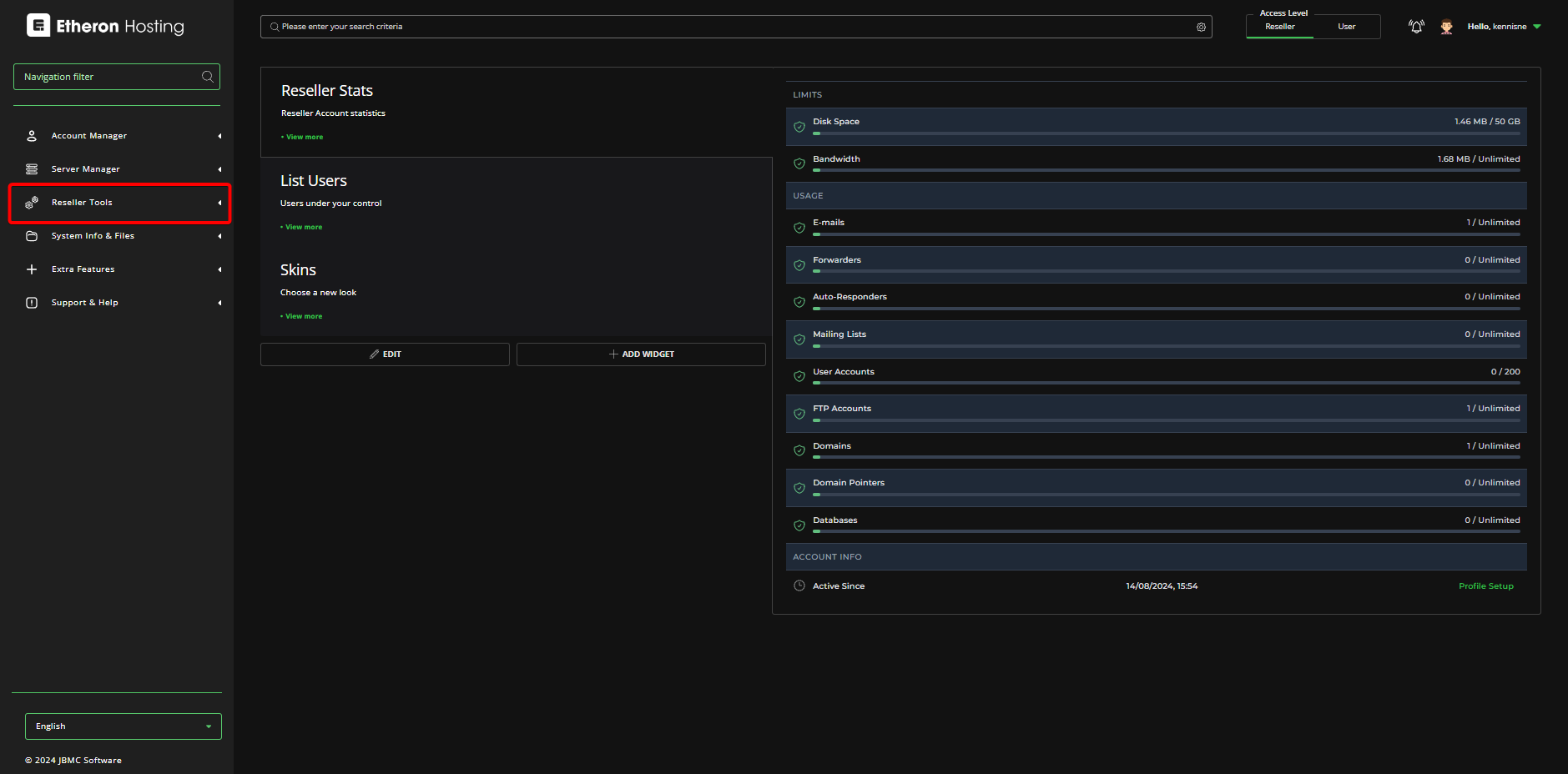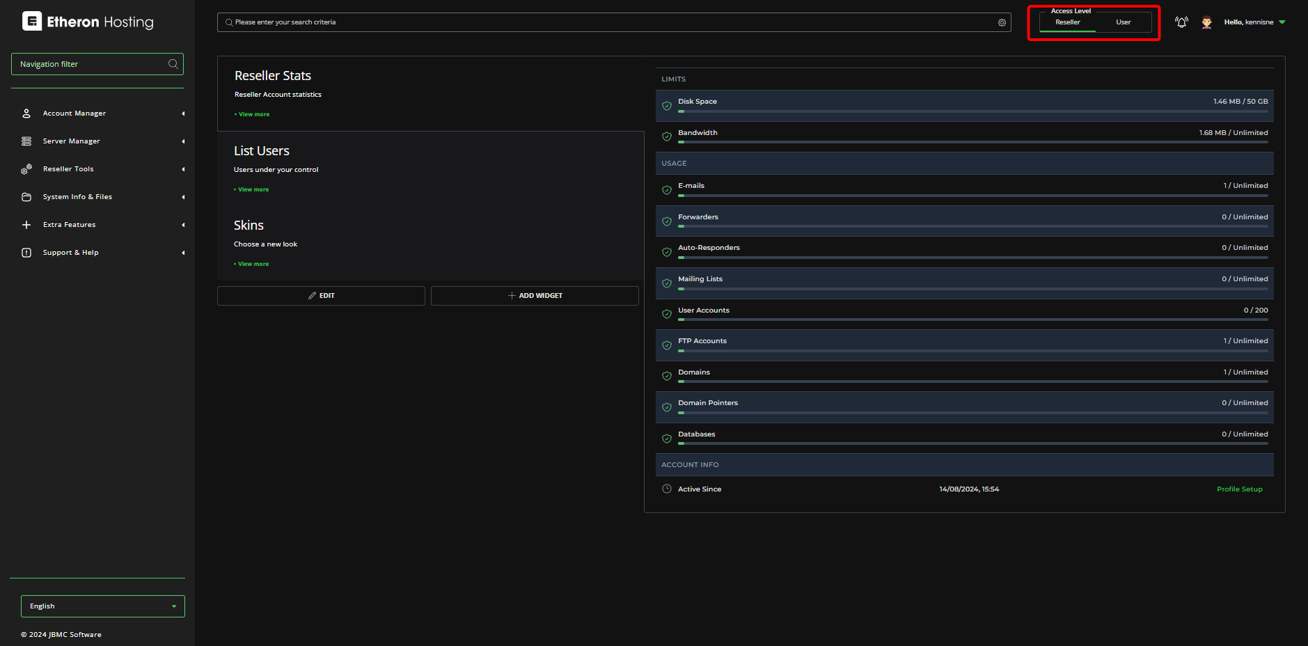 2. Zorg ervoor dat je Access Level op Reseller staat.