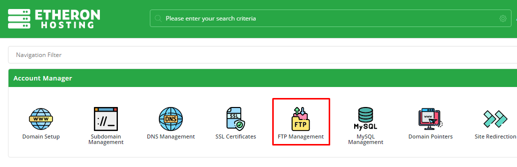Ga naar het DirectAdmin paneel en klik op FTP management.
