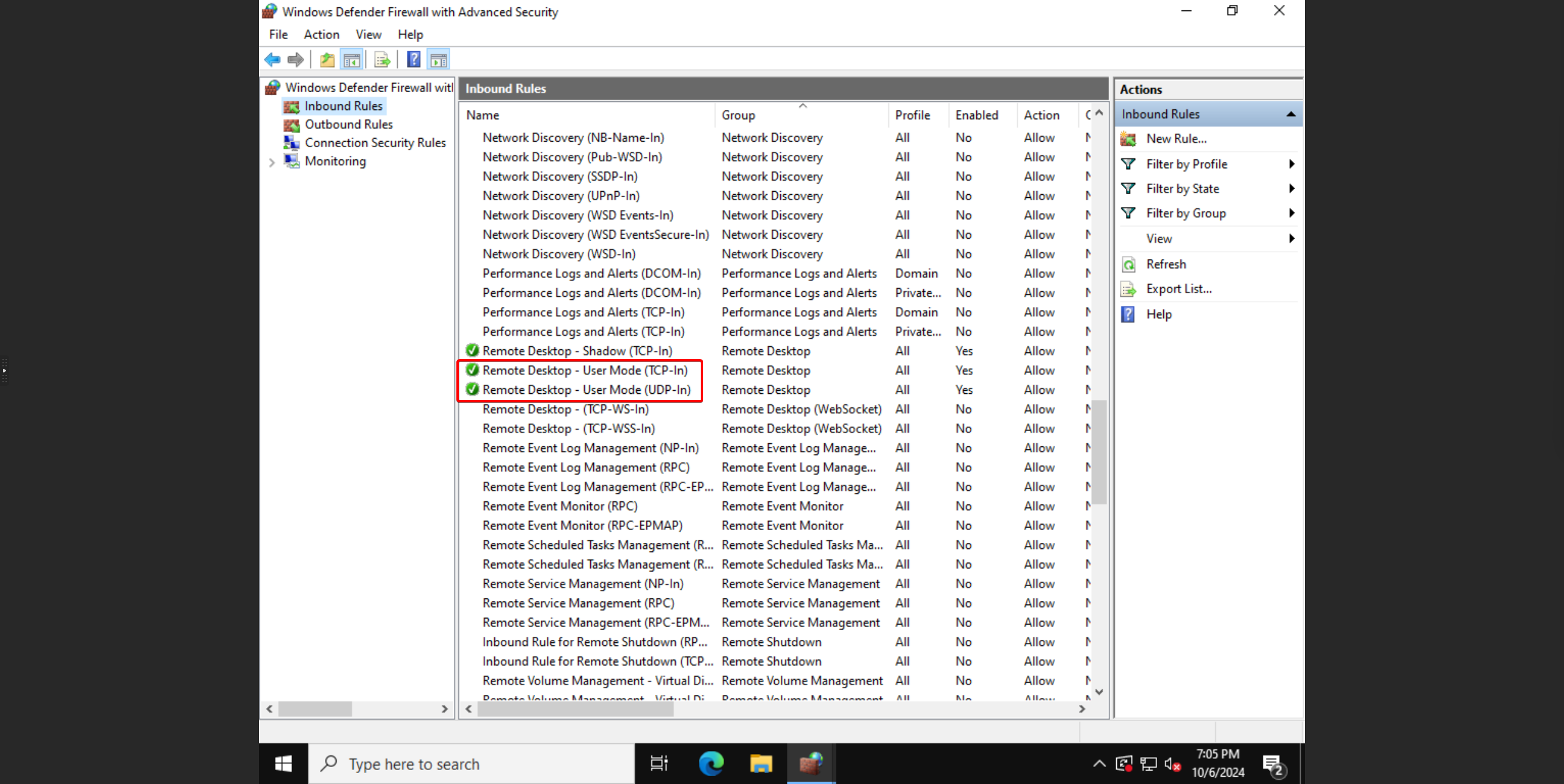 - Zoek nu naar Remote Desktop - Use mode (UDP-in), dat zich meestal direct boven of onder de vorige regel bevindt.