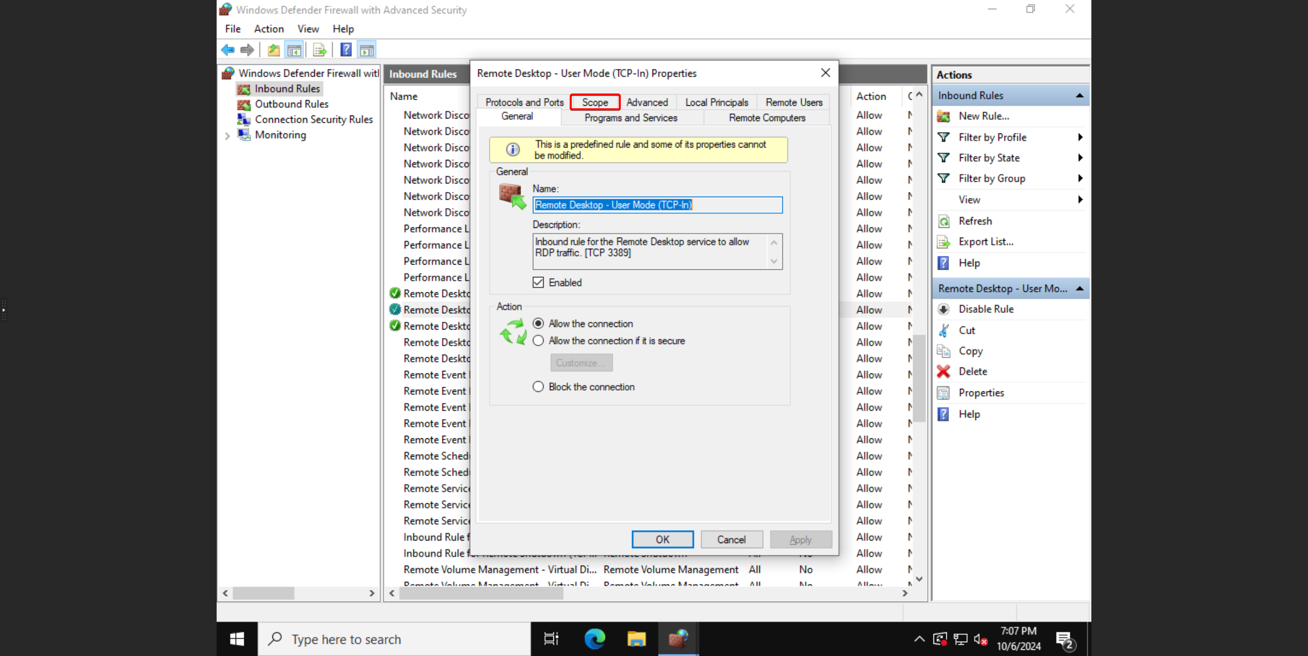 - Scroll naar beneden tot je bij Remote Desktop bent. Zoek hier naar** Remote Desktop - Use mode (TCP-in)**. Dubbel klik hier op.